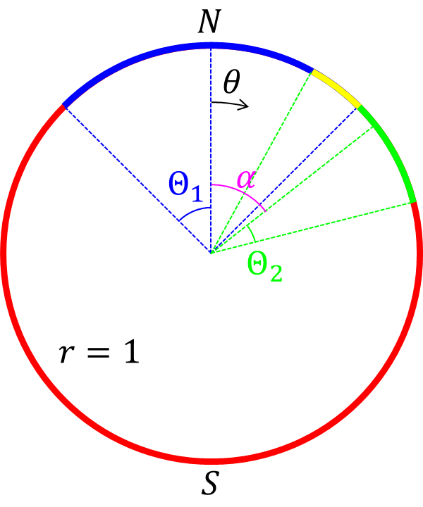 次はキャップとキャップが重なった部分の面積を考えてみましょう。劇的に難しくなります。次のような図3の状況を考え見ましょう。青のキャップと緑のキャップがあって、その重なり部分である黄色の面積を求めたいという問題です。青と緑のキャップの開き角がそれぞれ \(\theta_1、\theta_2\)でありキャップの中心がなす角は \(\alpha\)です。