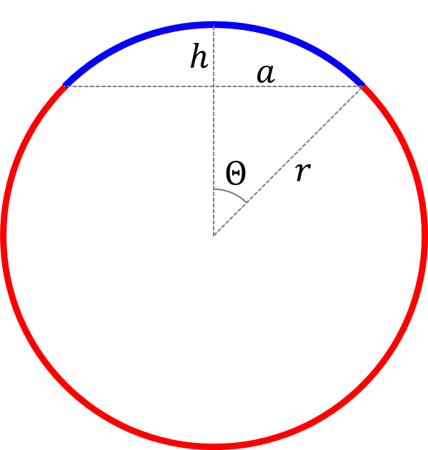 キャップとは、球がある平面で切断されたときにできるお椀のような形状をした立体のことです。次の図のように、半径 \(r\) の球が、原点から \(r-h\) だけ離れた平面によって切られ、底面の半径が\(a\)、 高さが \(h\) 、開き角が \(\Theta\) のキャップ(青色)に分かたれたとします。このキャップの面積を求めてみましょう。