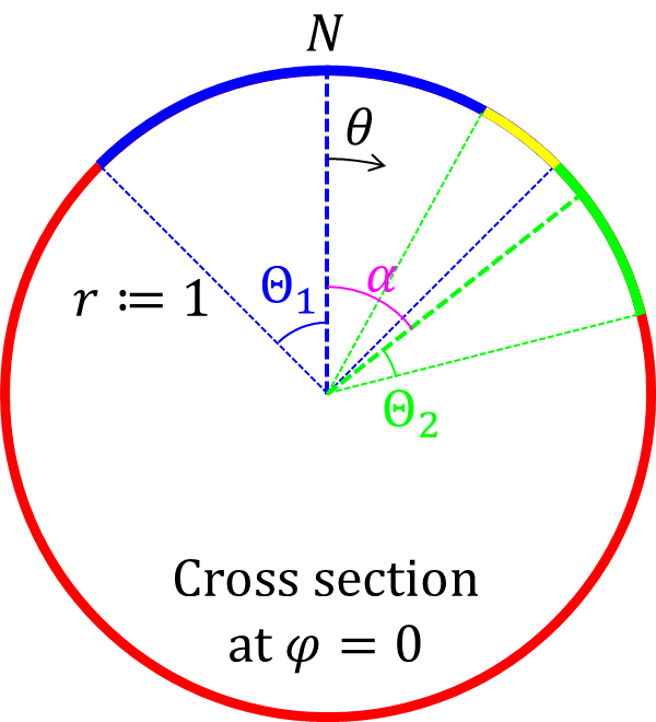 今度は次のような図6の状況を考えます。青のキャップと緑のキャップがあって、その重なり部分である黄色の面積を求めたいという問題です。青と緑のキャップの開き角がそれぞれ \(\Theta_1、\Theta_2\) でありキャップの中心がなす角は \(\alpha\) です。青のキャップの中心は北極点 \(N\) に一致し、緑のキャップの中心は経度ゼロの円上にあるとします。なお、以降は球の半径 \(r\) は1であるとします (そうでない場合は全ての答えに \(r^2\) を乗じるだけです)。
