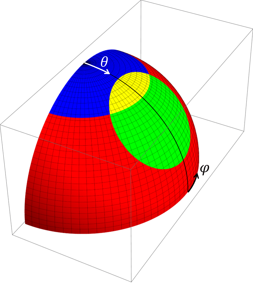 P(\theta, \varphi)= (\sin\theta\cos\varphi, \sin\theta\sin\varphi, \cos\theta)$$と表現できます。青キャップの中心は\(C_1=(0,0,1)\)であり、緑キャップの中心は\(C_2=(\sin\alpha,0,\cos\alpha)\)です。点\(P\)が青のキャップに含まれる条件は\(\theta \le \Theta_1\)であり、緑のキャップに含まれる条件は$$