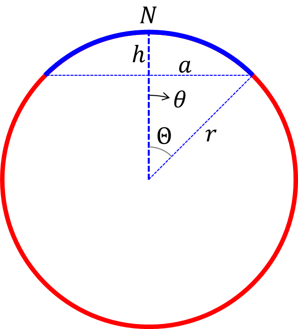 このキャップの表面積\(A\)は、キャップ中心\(N\)との成す角度 \(\theta\) で積分すれば求まります。すなわち$$A=\int_0^\Theta {2 \pi r^2 \sin\theta\ d\theta} = 2\pi r^2 (1-\cos\Theta) $$となります5。\(r (1-\cos\Theta)=h\) なので \(A=2\pi r h\) と書くこともできますし、\(r^2=a^2+(r-h)^2 \leftrightarrow 2rh=a^2+h^2\) なので \(A=\pi (a^2+h^2)\) と書くこともできます。