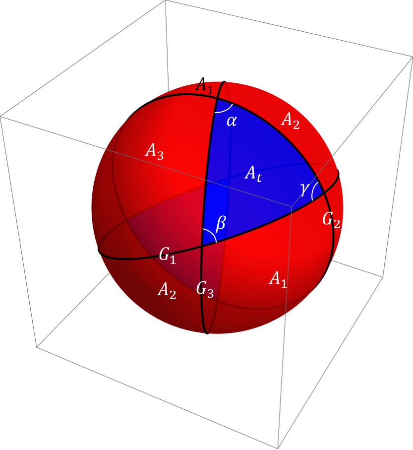 さて球面三角形を定義する3つの大円を次の図のように \(G_1, G_2,G_3\) とします。また大円によって分かたれる各領域の面積を \(A_t, A_1, A_2, A_3\) のように定義します。もちろん求めたいのは \(A_t\) の部分です。\(G_2\)と\(G_3\)に囲まれかつ \(A_t\) を含むルーネ\(L_1\) の面積は $$2\alpha = A_t+A_1$$ です。残り二つのルーネも同様に \(L_2, L_3\)と定義すればそれらの面積はそれぞれ $$2\beta = A_t+A_2,\quad 2\gamma=A_t+A_3$$ となります。これらをまとめると、$$3A_t+A_t+A_1+A_2+A_3=2 (\alpha+\beta+\gamma)$$ が得られます。最後に \(A_t+A_1+A_2+A_3\) が半球の面積 \(2\pi\) であることを利用して以下の式が得られます。$$A_t = \alpha+\beta+\gamma-\pi=E$$