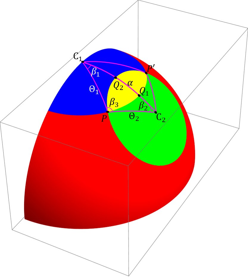 もう一つの解き方は、球面三角形の問題に帰着する方法です。図のように、青と緑のキャップの中心を\(C_1, C_2\)、交点を \(P, P’\) とします。球面三角形 \(C_1 C_2 P\) と \(C_1 C_2 P’\) は合同なので、前者だけを考えます。 \(C_1 C_2 P\) の各辺の(円弧の)長さは \(\Theta_1, \Theta_2, \alpha\) であり、内角は \(\beta_1, \beta_2, \beta_3\) であるとします。また 辺 \(C_1 C_2\)と黄色境界線が交わる点を \(Q_1, Q_2\) とします。このように考えると、黄色領域の面積は、「 扇領域 \(C_1 PQ_1\) と \(C_2 PQ_2\) の面積の和から、球面三角形 \(C_1 C_2 P\) の面積を引き、最後に2倍」 することで求まることがお分かりいただけると思います。
