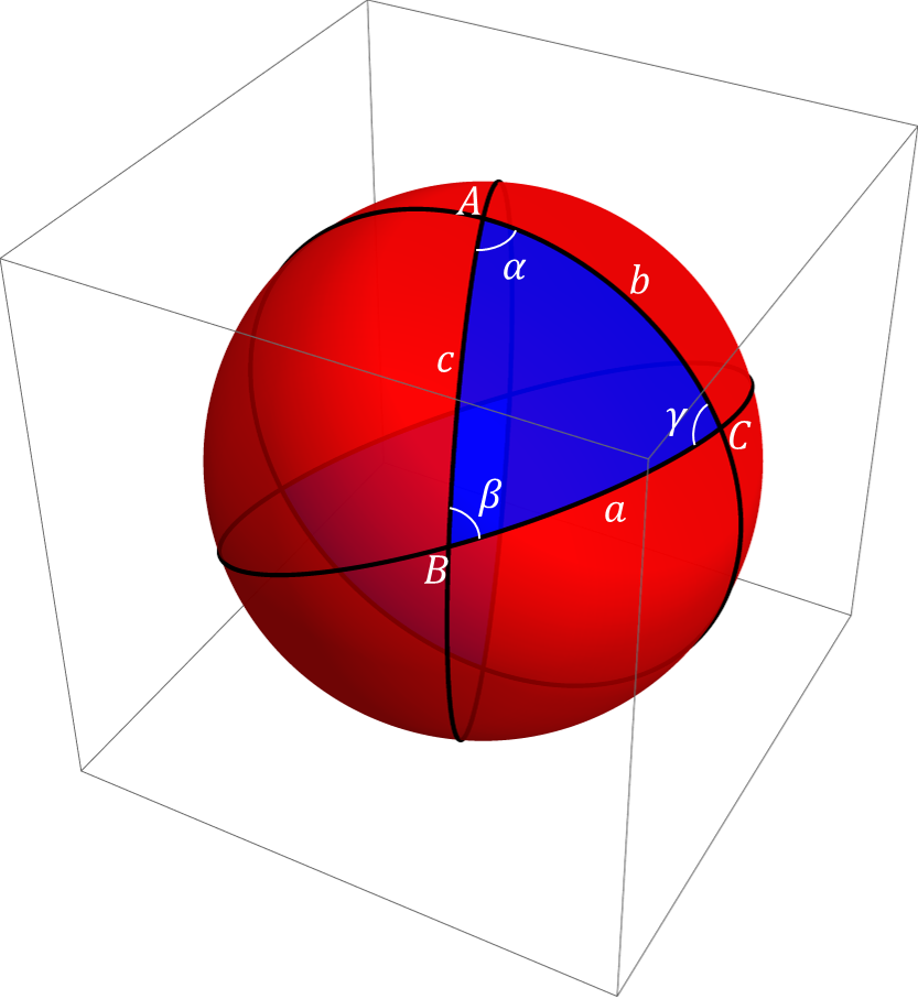 図2のような球面を考えます。青色で示した領域は、3つの大円に囲まれた球面上の図形です。三つの頂点 (大円の交点) を \(A, B, C\)、各辺の長さを \(a, b, c\)、各内角を \(\alpha, \beta, \gamma\) とします。なお、辺の長さ \(a, b, c\) は (頂点間の距離ではなく) 球面上の円弧に沿った長さです。したがって、 \(a, b, c\) は (球の半径が1であれば) 2つの頂点間の角度に相当します。このような三角形を、球面三角形 (spherical triangle) といい、この三角形に関する種々の方法論を球面三角法 (spherical trigonometry) といいます。球の半径を 1 として以下のような定理があります。比較のため平面三角法と並べてお示しします。