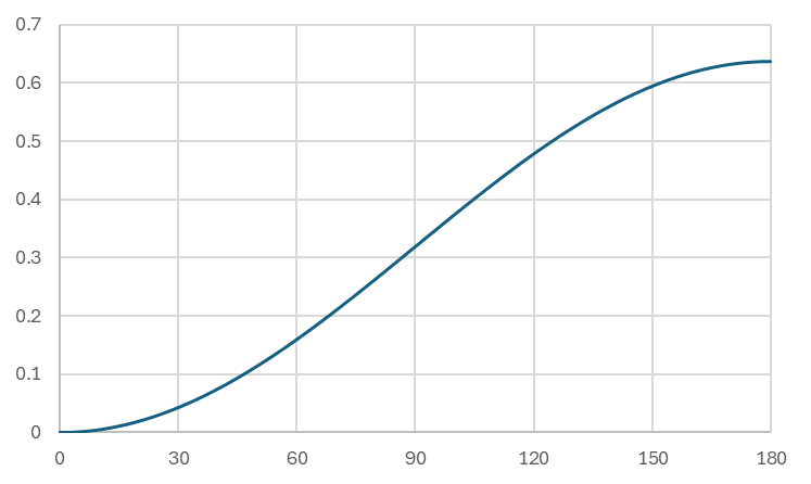 次の図は横軸をラディアンではなく度で表示しています。方位角度差が小さい (\(\theta\)が小さい) 状態を見出す確率は低く、大きい状態ほど高くなり、180度で緩やかに上限に達するという傾向は、直感的にも理解が容易かと思われます。